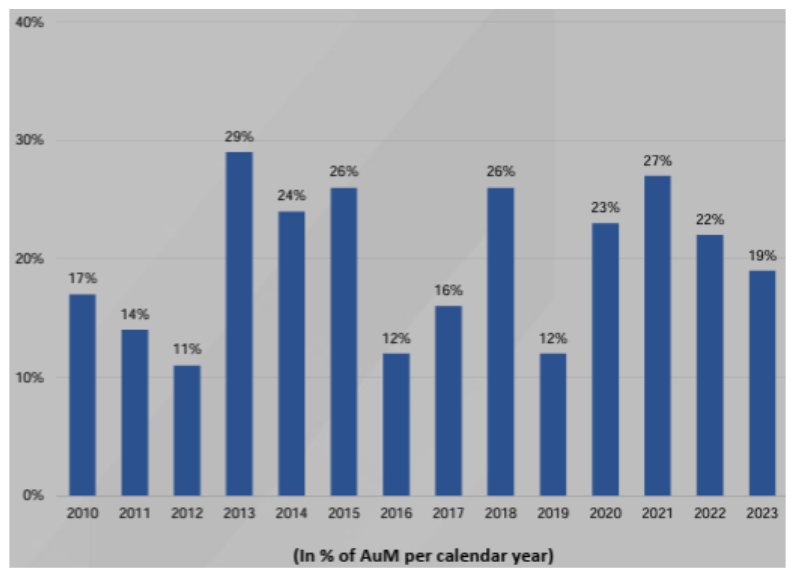 Otra señal de consistencia es que, desde lanzamiento, solo ha terminado en negativo en tres años (2008, 2018 y 2020), es decir, en torno al 85% de los ejercicios cerró en positivo.