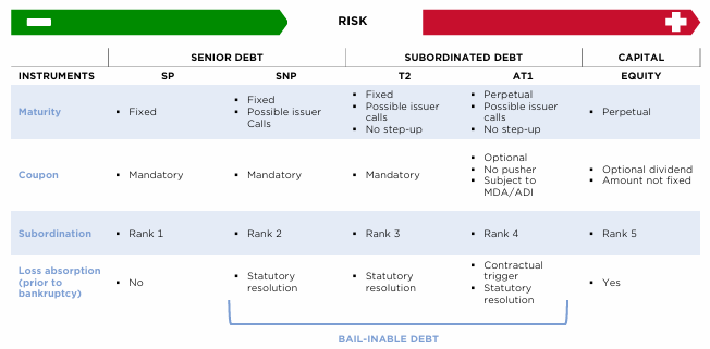 Dentro de la estructura de capital de un banco, los bonos sénior son los más seguros, mientras que la deuda subordinada asume más riesgo a cambio de un cupón más alto. En el extremo final se encuentra el accionista, que es el último en cobrar en caso de quiebra.