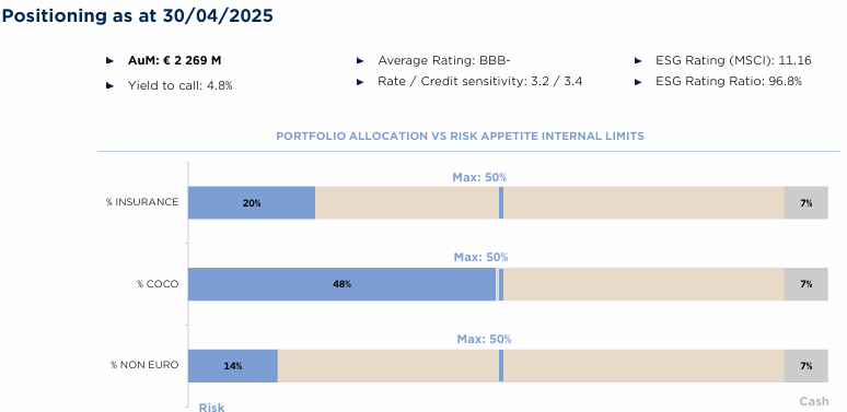 Los CoCos representan cerca de la mitad de la cartera, sin superar el límite interno del 50%. Esta posición muestra la apuesta del equipo por los instrumentos con mayores cupones dentro del sector financiero, pero siempre en emisores sólidos y bien capitalizados. El resto se compone de bonos de aseguradoras y una ligera exposición fuera de la zona euro, con el objetivo de mejorar la diversificación.