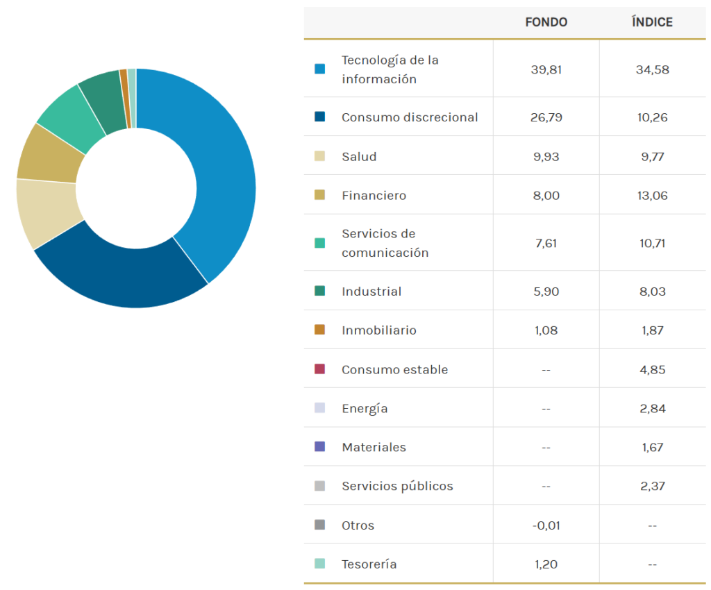 La cartera se concentra en dos bloques: Tecnología y Consumo Discrecional. Entre ambos rondan el 70% y están sobreponderados frente al S&P 500, sobre todo Consumo Discrecional. Detrás aparecen Salud y, bastante por debajo del índice, Financieras y Servicios de Comunicación. No hay posiciones en consumo estable, energía o materias primas. Esta foto responde al stock-picking, no a una apuesta macro: el equipo encuentra más “empresas únicas” en sectores donde la innovación manda.