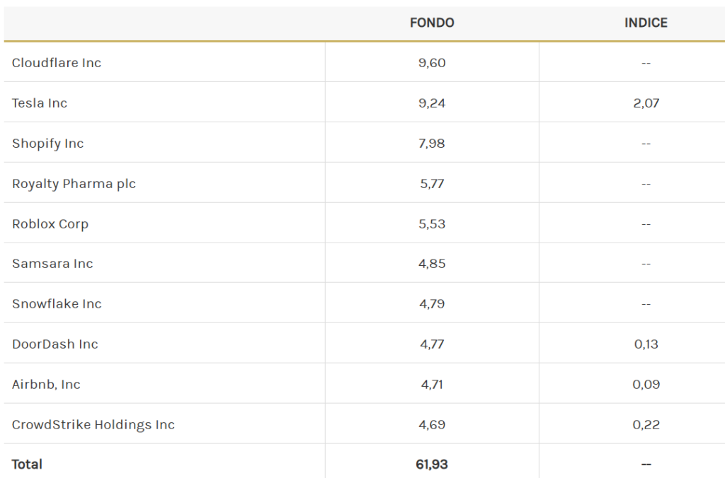 Lo más revelador es la ausencia de gran parte de las “7 magníficas”. Durante un tiempo Amazon fue la excepción y sin un peso dominante. Varias posiciones del top 10 ni siquiera forman parte del S&P 500. La intención es clara: diferenciarse buscando la próxima generación de ganadores antes de que sea consenso.