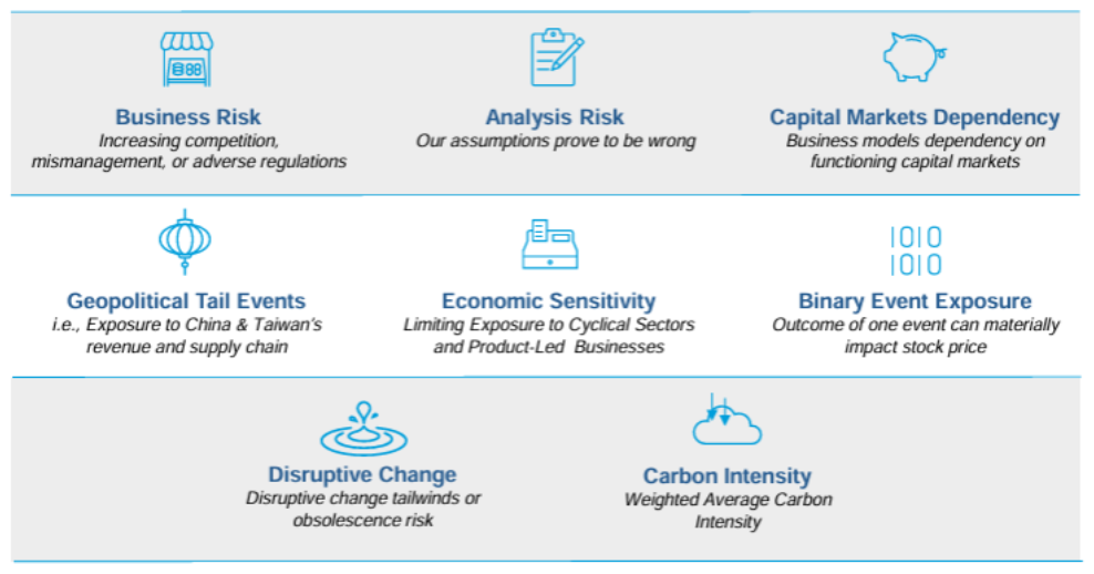Monitorean, pero no gestionan riesgo de mercado o de factores: aceptan volatilidad si los fundamentales lo sostienen. Su control se centra en evitar pérdidas permanentes, vigilando disrupción competitiva, ejecución, regulación, dependencia de financiación o riesgos geopolíticos.